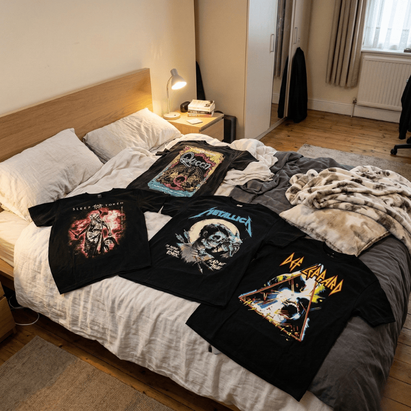 A glimpse of our rock-inspired merch celebrating legendary bands and iconic music culture.